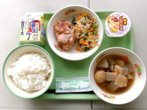 ごはん、牛乳、鶏肉のみそ焼き、がんもの含め煮、三色和え、栗のムース
