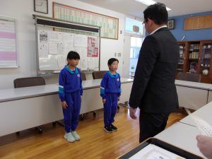 17日(水)の給食の時間に、校内書初大会で金賞に輝いた児童に賞状を渡しました。