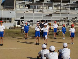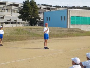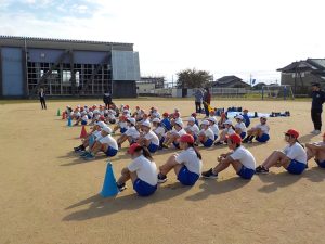 各学年の代表児童が目当てを発表し、大会に関する諸注意が伝えられた後、全員で準備体操を行いました。