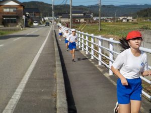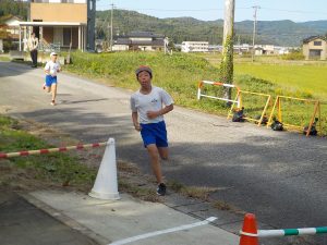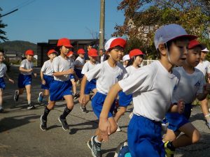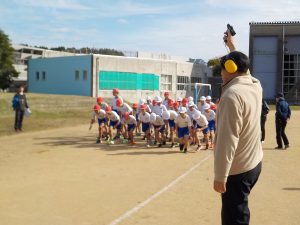 上学年は2kmのコースで、まずグラウンドを2周し、その後公道へと進みます。合図が鳴ると、上学年の子供たちも一斉に力強くスタートしました。