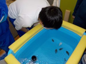 子供たちが水そうに顔を近づけると、数ひきのヒラメが縦泳ぎをして水面に上がってきます。
