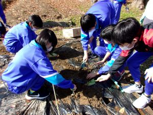 3時間目に、全校児童でランチルーム横の花壇にチューリップの球根を植えました。