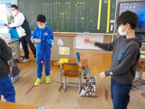 なわとび運動、百人一首で坊主めくり、けん玉、お手製のボーリング?などなど