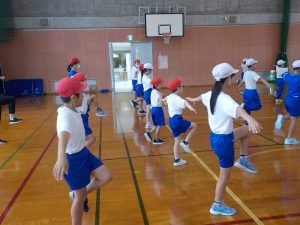 スキップしながら走ったり、片足立ちやV字バランスをしたり、いろいろな動きの運動にチャレンジしました。