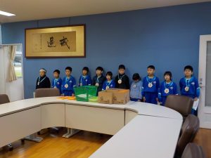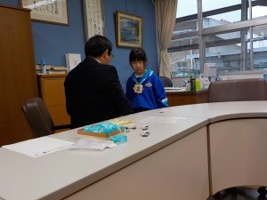 今日は、校長室で2年生が算数の学習でがんばってきた「かけ算九九名人への道」の最終テストをしました。