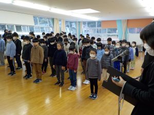 次に、生徒指導担当の先生が「3学期の目当て」について話しました。子供たちが明るくなるように、歌とダンスで伝えてもらいました。子供たちは手拍子をしながら笑顔で聞いていました。