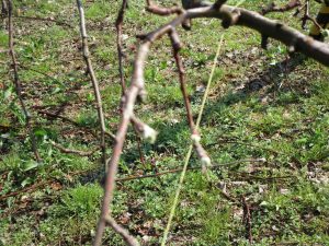 暖かな日差しの中、りんごの芽が大きくふくらみ、中には若葉を広げ始めているものもあります。