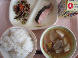 この日はご覧のとおり、彩り鮮やかな給食でした。また、噛みごたえのあるれんこんやごぼう、大根、にんじんのおいしさを感じながらおいしくいただきました。