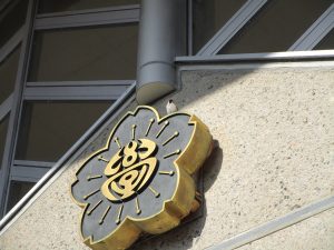 本校の玄関上部にある校章のレリーフに、今年もスズメが巣作りを始めました。