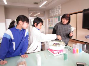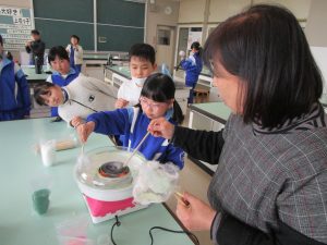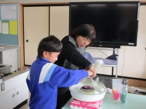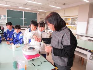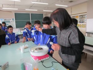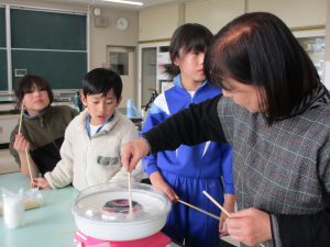 砂糖に熱を加えるとどうなるか、と綿菓子をつくって確認していました。