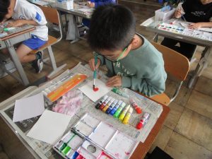 浮き彫りをしている子供がいるので、「デザインを目立たせるいい彫り方だね。調べたの?」と聞くと、「彫っていると、こんなふうになりました」の答えが。