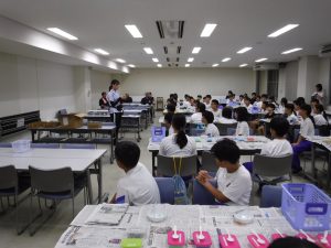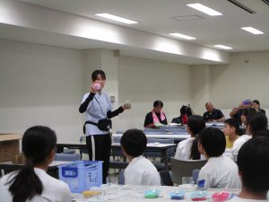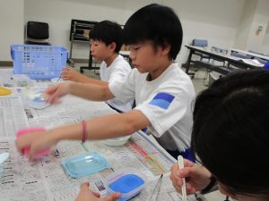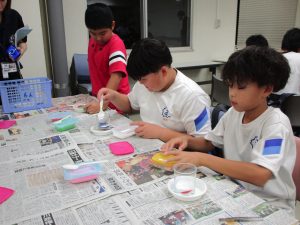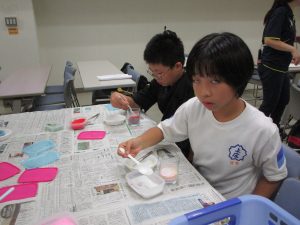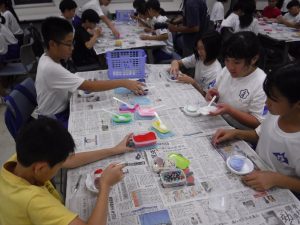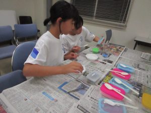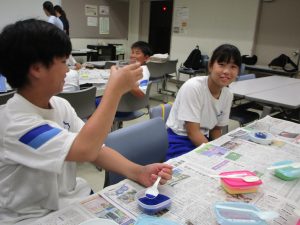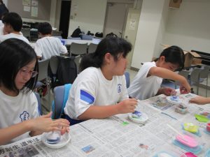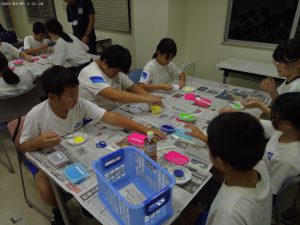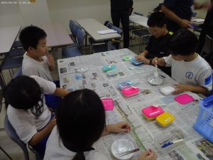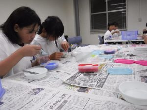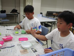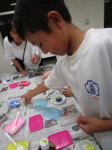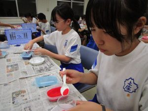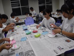 夕食後の予定は肝試しでしたが、降雨が予想されたため、「クリアキャンドル作り」を行いました。