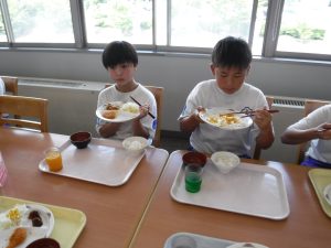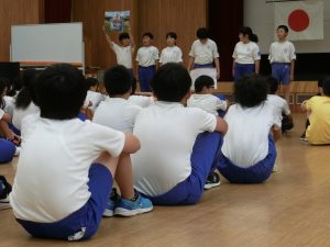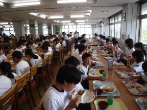 給食の時間に、給食センターの江渕先生が来てくださり、栄養についてお話ししてくださいました。