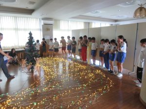 2時間目は、氷見ふるさとエネルギーの方と、発電の仕組みや太陽光発電のよさ等について学びました。こちらも、体験がいっぱいの驚きや感動の連続の学習でした。最後に、電気自動車の電気を使ってイルミネーションを点灯。「うわあああ」の歓声!電気のある生活の楽しさやよさを実感し、電気を大切にしていこうという思いをもつことができました。