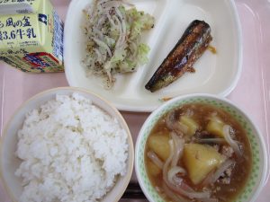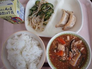 この日はご覧のとおり、彩り鮮やかな給食でした。また、噛みごたえのあるれんこんやごぼう、大根、にんじんのおいしさを感じながらおいしくいただきました。