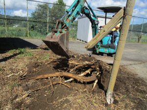 ユンボを巧みに操作し、藤の根やコンクリートの支柱を取り除いてくださいました。