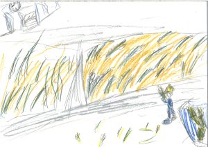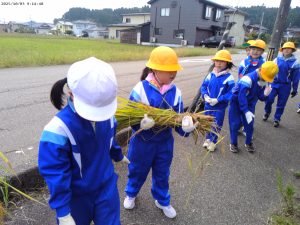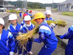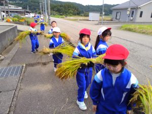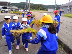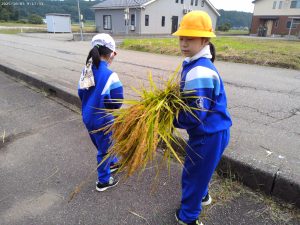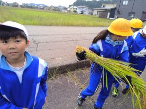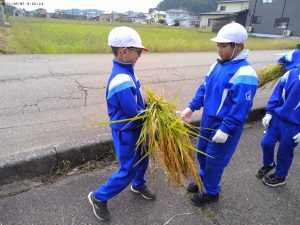 最初、成長した稲を見て「おお!」とびっくりしました。初めの頃小さくて緑色だったのが大きくなってきれいな肌色になってお米が育っていました。運んでいる時もいいにおいがして、「早く食べたいな」と思いました。そして、1~3年生がてきぱきと運んでいて頑張ろうという気持ちになったし、5、6年生も稲を刈っているのがまぶしかったです。来年、私も稲を刈るのでみんなからすごい、と思われるよう頑張ります。5、6年生には感謝を伝えたいです。