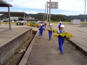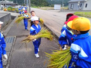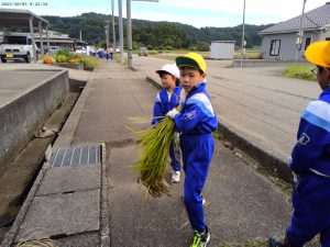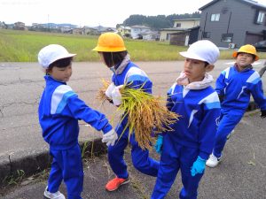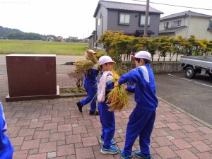 5、6年生、田んぼが泥だらけなのに稲を刈ってくれて、ありがとうございます。稲が重かったけれど、たくさん運びました。3年生も手伝ってくれて、ありがとうございます。3年生になったら、もっと頑張ります。