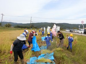 初めて稲を刈るので少し緊張したけれど、思ったより上手くいったのでよかったです。稲をしばるときは、結束バンドが表裏が逆にならないようにしたり、曲がらないようにしました。稲刈りができるのは協力してくれた方たちがいたからできたので、とても感謝しています。もちつき集会のときも協力してくれる方たちに感謝しようと思います。