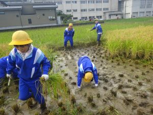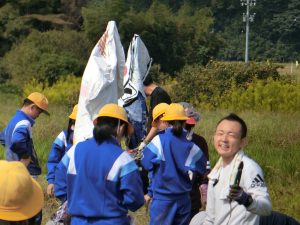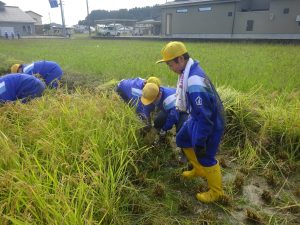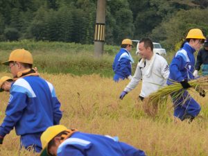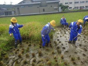 私は去年よりたくさん稲を刈ることができました。2回足がはまり、どろどろになったけれど、一生懸命に収穫をしてよかったです。成長した稲を見て早くもちにして食べたいと思いました。とても大きかったです。私の腰ぐらいまで稲があってびっくりし、食べたいと思いました。来年は中学校でいろんな行事も一生懸命に取り組みたいです。