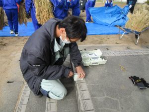 月曜日に、雨に濡れたため体育館のバルコニーに干していた稲の水分量は15%!もみすりをしても大丈夫だそうです。