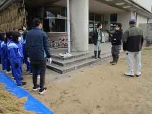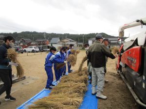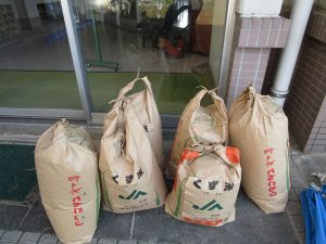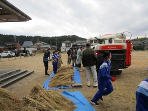 しかし、外で稲架がけをしていた米は、まだ水分量が多いそうなので、今日脱穀した後、多目的ホールに広げて干すことになりました。