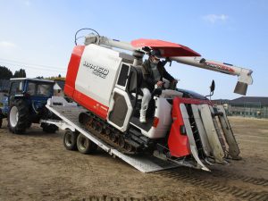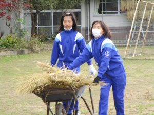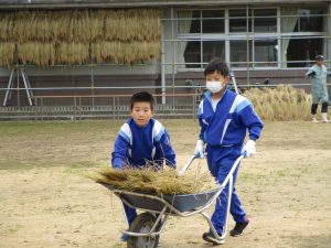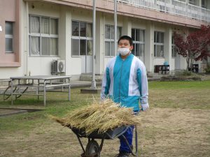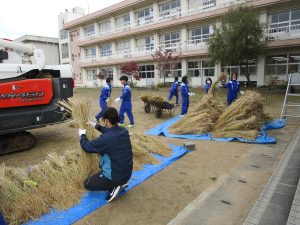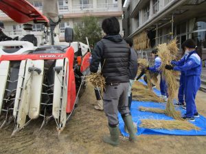 今日、柿谷の干場さんがコンバインを運んできてくださり、10月に全校で稲刈りをした稲束の脱穀をしました。