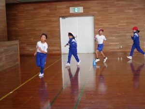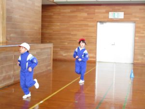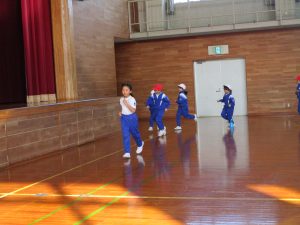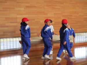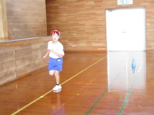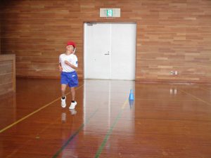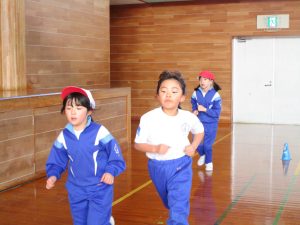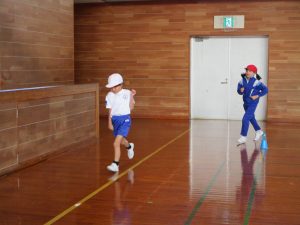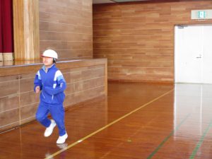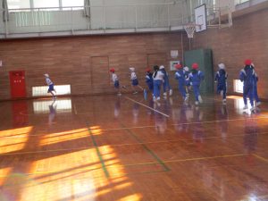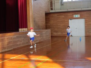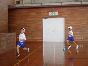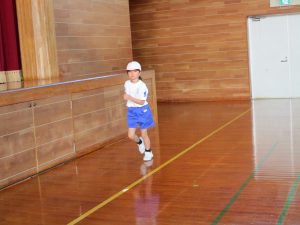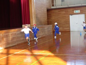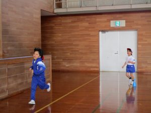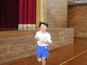 2年生の体育の時間。晴れていれば外で学年マラソン大会をしたかったそうですが、グラウンドが乾いていなかったので、体育館で5分間走しました。