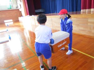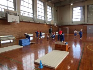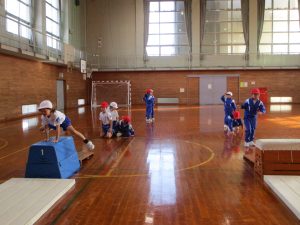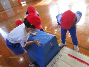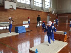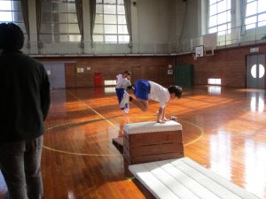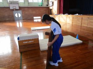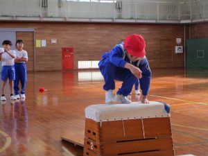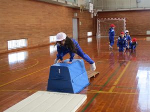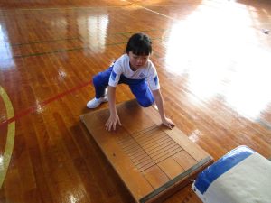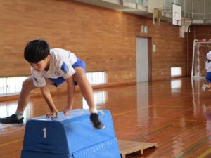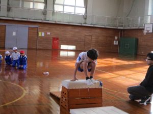 閉脚跳びは、スモールステップで練習を進めています。まず、踏み切って跳び箱の上に乗ります。次にジャンプしております。