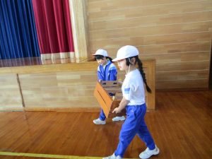 普段使っている筆とは違い太くなっていること、机ではなく床に敷物を敷くことなど、初めてのことばかりで、1回目は、用具の準備練習を行いました。