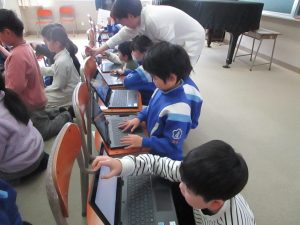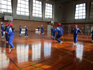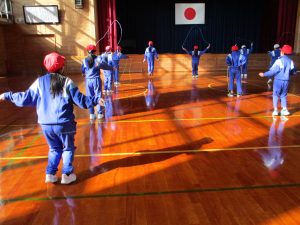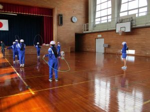 前跳び、後ろ跳び等々、できるだけ長く、たくさん跳ぼうと頑張っています。この後、体育主任から配付される縄跳びカードを基に目標を立て、目当てに向かってあきらめずに取り組むことを期待しています。