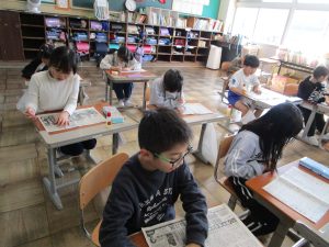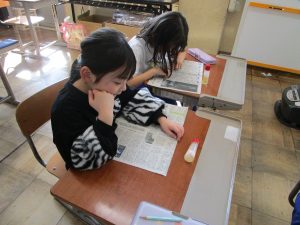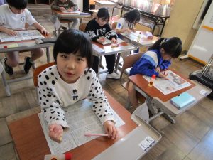 2年生 図工「新聞紙となかよし」に向けての、新聞紙で「の」の字さがし