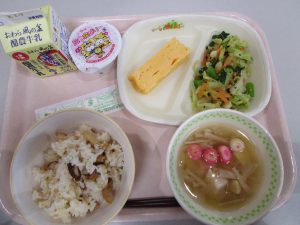 この日はおひな祭り献立でした。かわいらしい色の麩が鮮やかなすまし汁は目を楽しませてくれました。