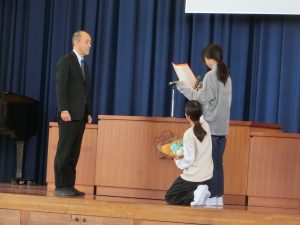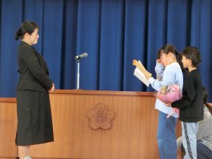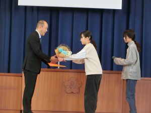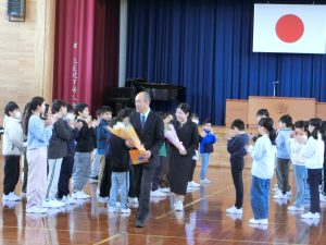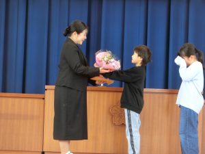 久しぶりに会えてうれしいのに、さみしい、そんな気持ちが表情に現れていました。感謝の言葉と花束を渡しました。一緒に過ごしたことをバネにして、なりたい自分を目指してどんどんチャレンジしてほしいとエールをもらいました。
