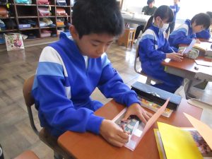 4年生の教室では、高齢者の皆さんに菊を届けに行くときに渡す、メッセージカードを作成しています。