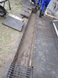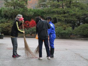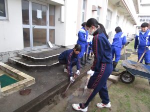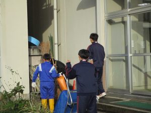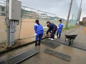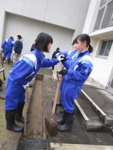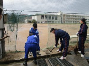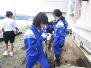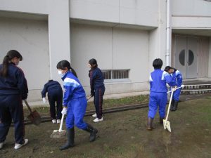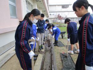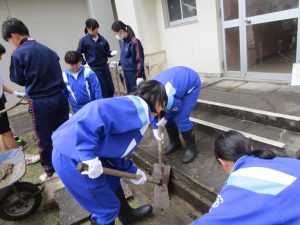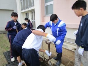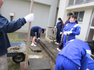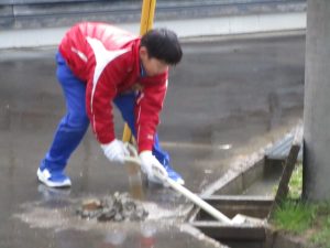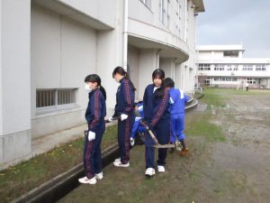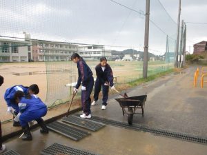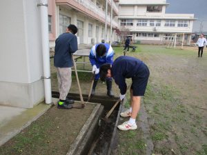 28日(金)雨が降ったりやんだりのあいにくの天気でしたが、本校を卒業した中学校の2年生が来て、6年生と一緒に溝掃除をしてくれました。