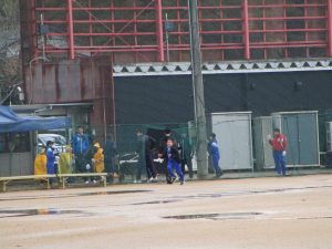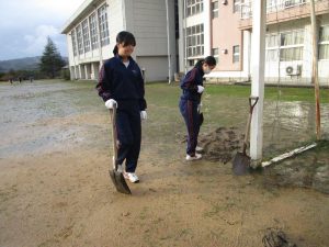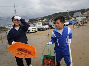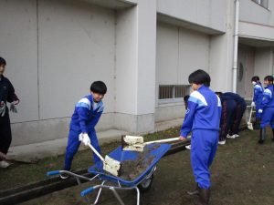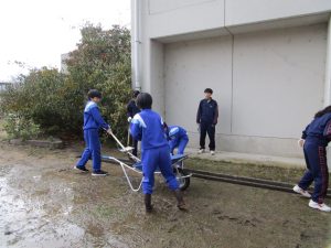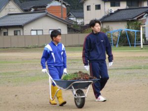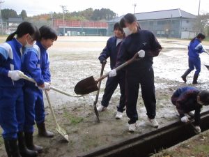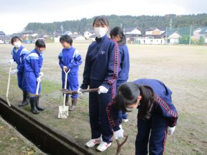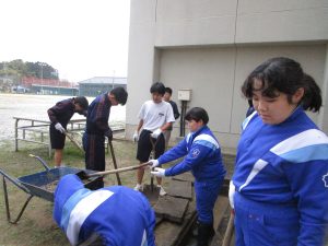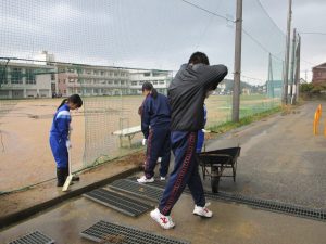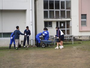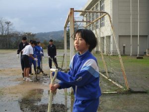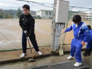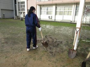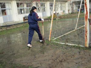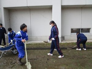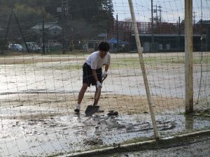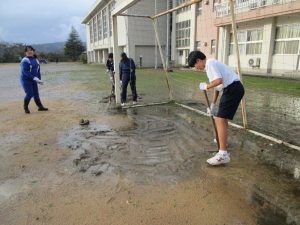 後期生と会長となった先輩は、泥を平らにならして水たまりをなくそうと、時間いっぱい働いてくれました。