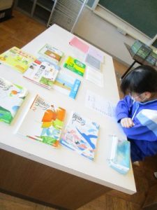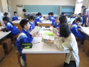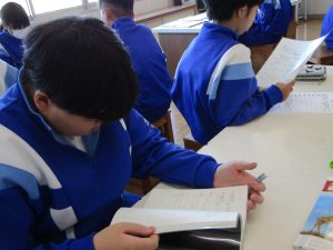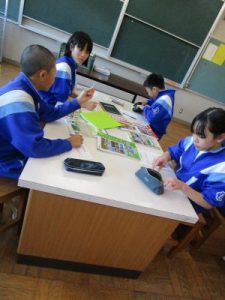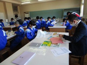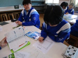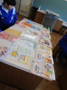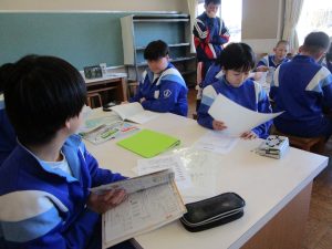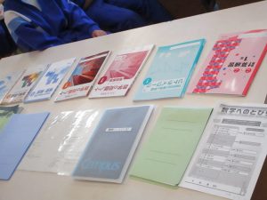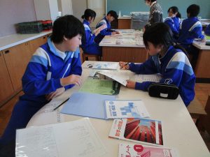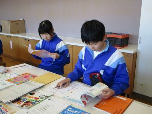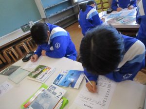 今回は、SCが準備してくださった、中学校で使用しているワークや資料集、先輩のノートなどを実際に見てみました。