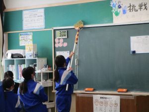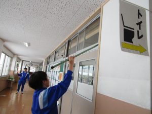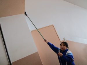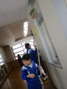 授業参観が迫っている今週、美化委員が保護者の方に気持ちよく学校に来ていただきたいと、クモの巣取りをしてくれました。