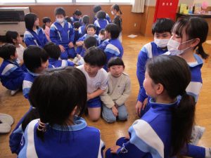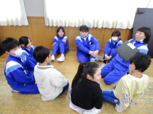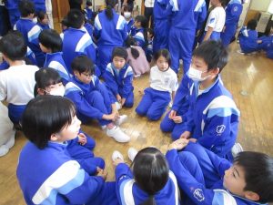 最初は生活委員会による「かみしょっ子あいさつ劇場」です。あいさつをしたのに返してもらえないと悲しいな。あいさつをしてもらうと、うれしいな、元気になるんだ。名優たちが教えてくれました。その後は、縦割り班のみんなで、どんなふうにあいさつをするとうれしいかを話し合い、練習してみました。「おはよう」「こんにちは」自然とニコッと笑顔も出ていました。