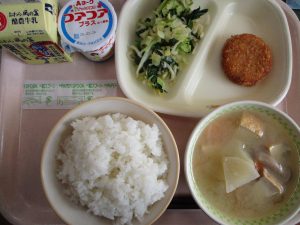 今日のおいしい氷見の味は、米、小松菜、元気コロッケのさつまいもとりんご、みそ汁のだしに使われている煮干し、大根、にんじん、ねぎでした。