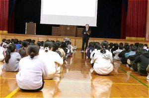 活動した後5年生の代表が、全校児童に朝ボランティア参加について放送で呼びかけました。