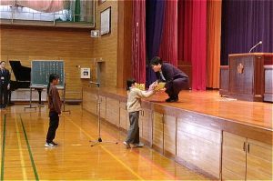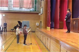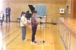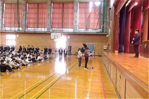 修了式の後は、講師の先生の離任式でした。3年生の代表がお礼の言葉を述べ、花束を手渡しました。