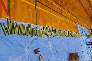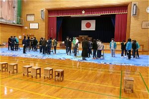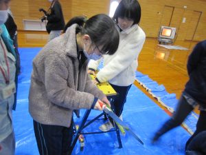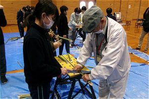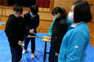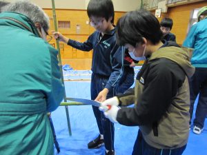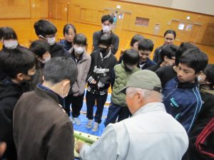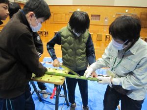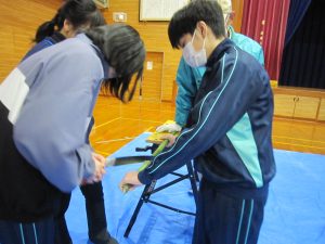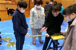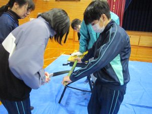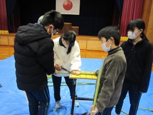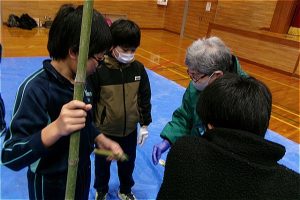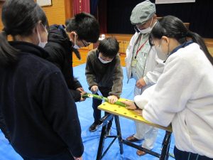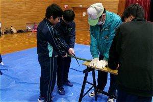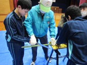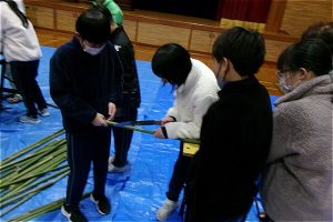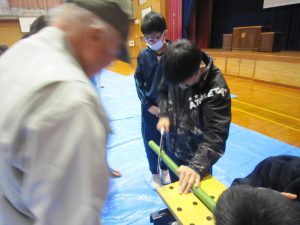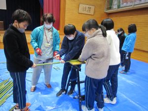 6年生は真竹の切断作業を行いました。30度の角度に切ることが難しく、教えてもらいながら
