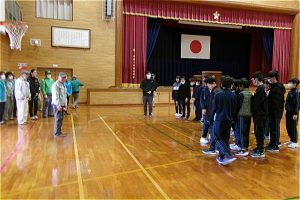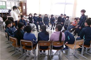 原木シイタケ栽培でお世話になっている仏生寺の六田さんが来校され、4年生の児童に原木シイタケを手渡してくださいました。