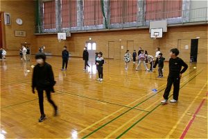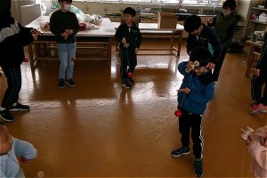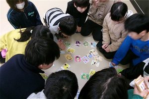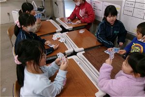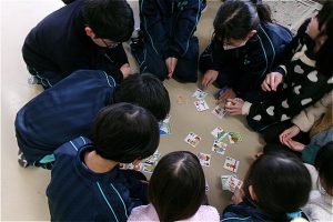 けん玉、フルーツバスケット、トランプ、ドッジビー、かるた等、各部屋に分かれ、縦割り班で楽しみ