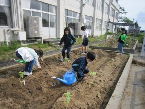 子供たちは、登校したらすぐに畑の水やりに行きます。
