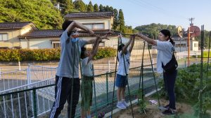 棚作りを行う中で、互いの棚の作り方をアドバイスする姿や子供たちと保護者が協力して一緒に網をピーンと張るために工夫する姿も見られました。