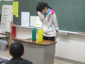 先生から黄色と緑色のペットボトルを提示され、2つの水のかさをどのように比べるか話し合っていま