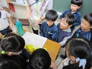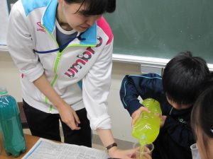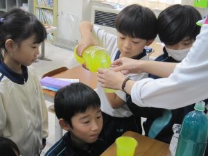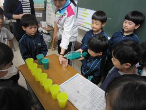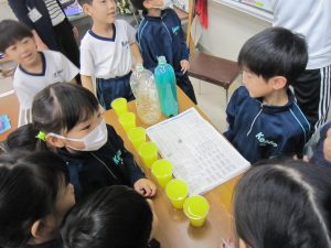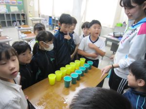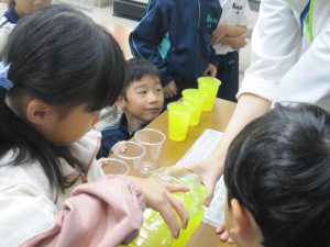 最後には、「同じコップで何杯入るかで比べる」ことを決め、一人一人水をこぼさないようにコップに